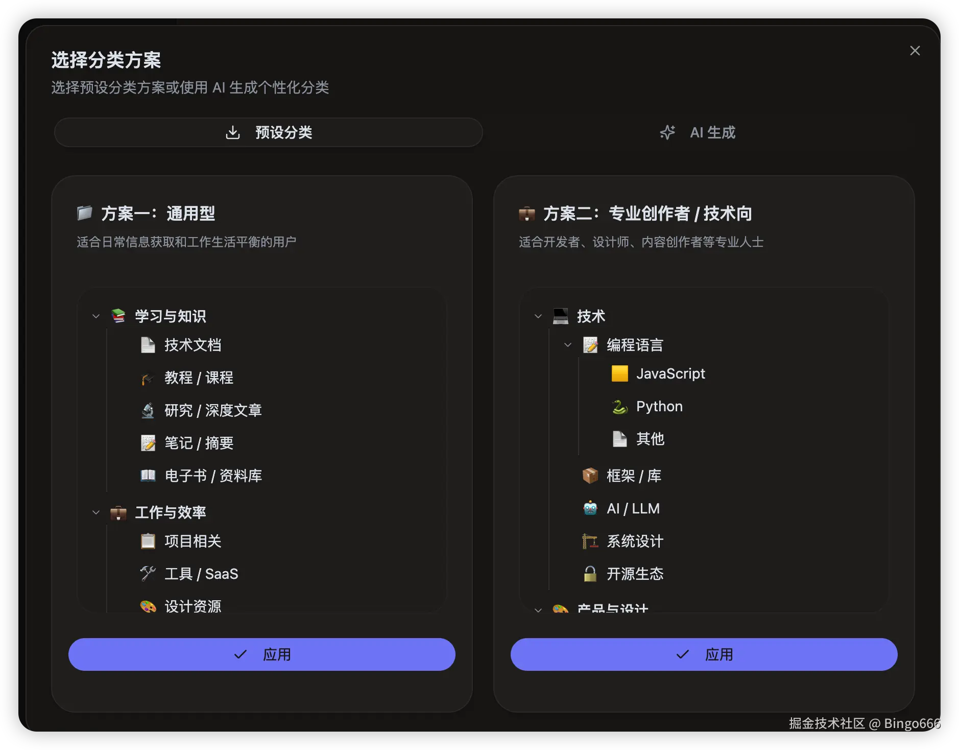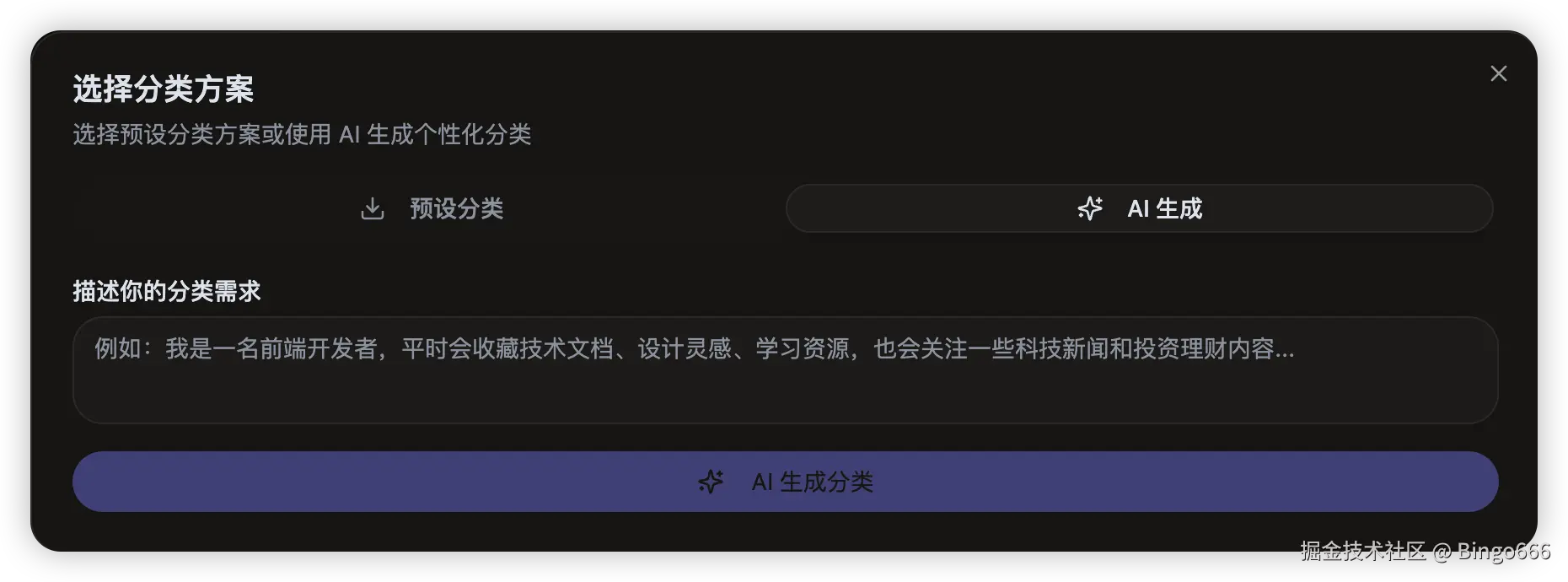 AI 生成分类(量身定制) 如果你不想"套模板",可以直接描述你的使用场景,让 AI 帮你生成一套适配你的分类结构: