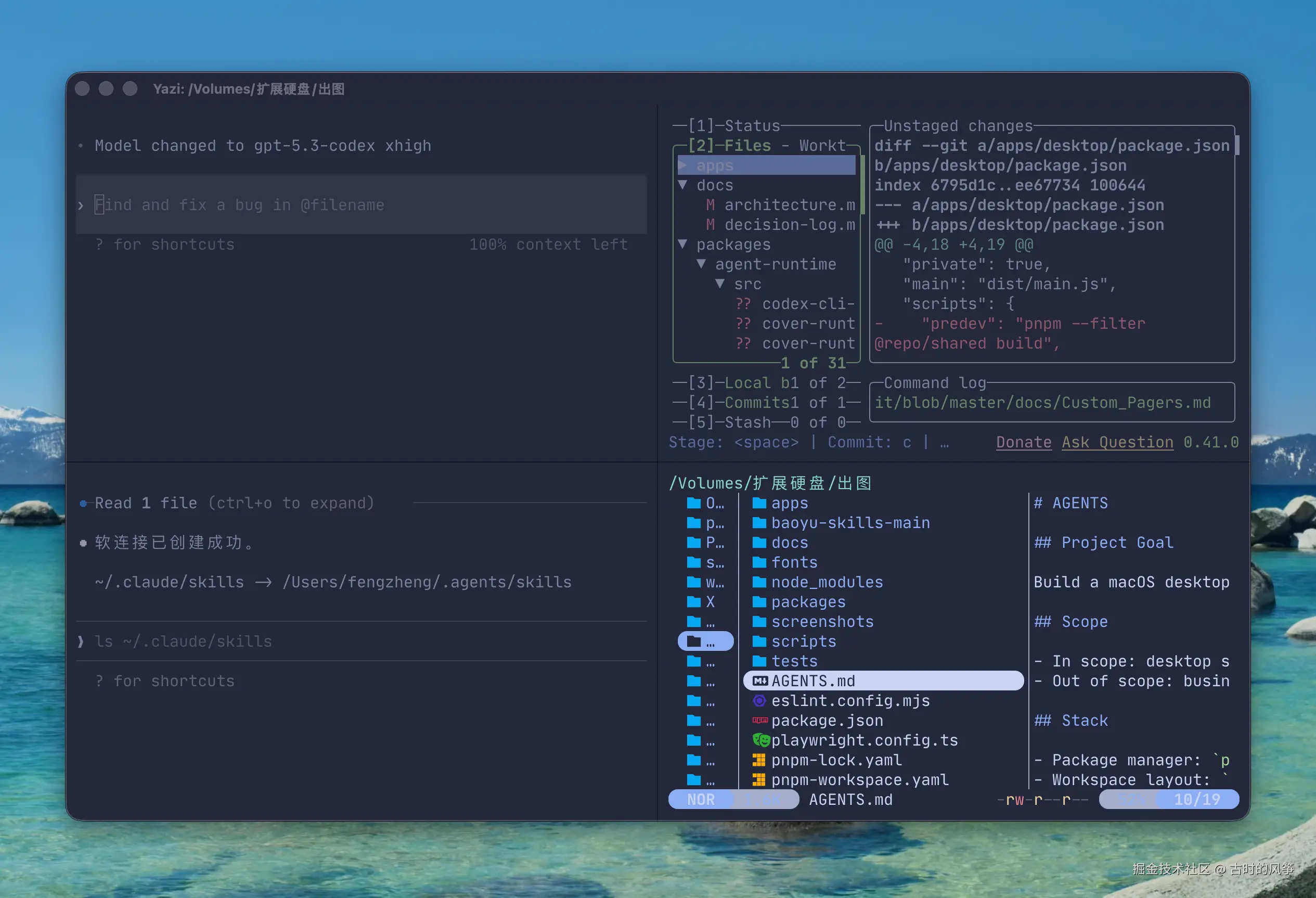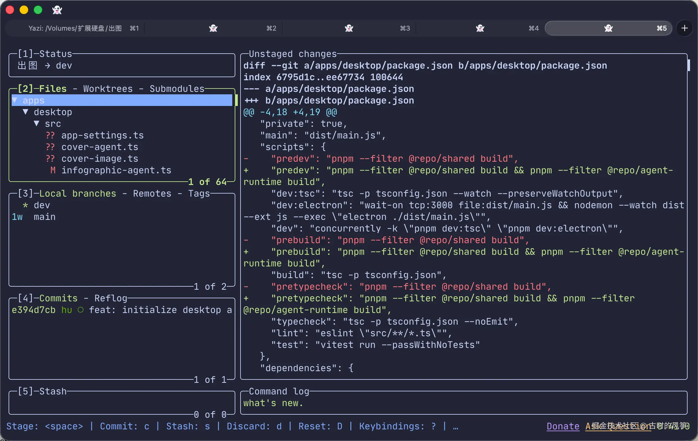 接着向下开新 tab,或者聚焦到左下角这个,cmd+d向右开新 tab,打开 lazygit 或yazi,也就是右下角这个。
