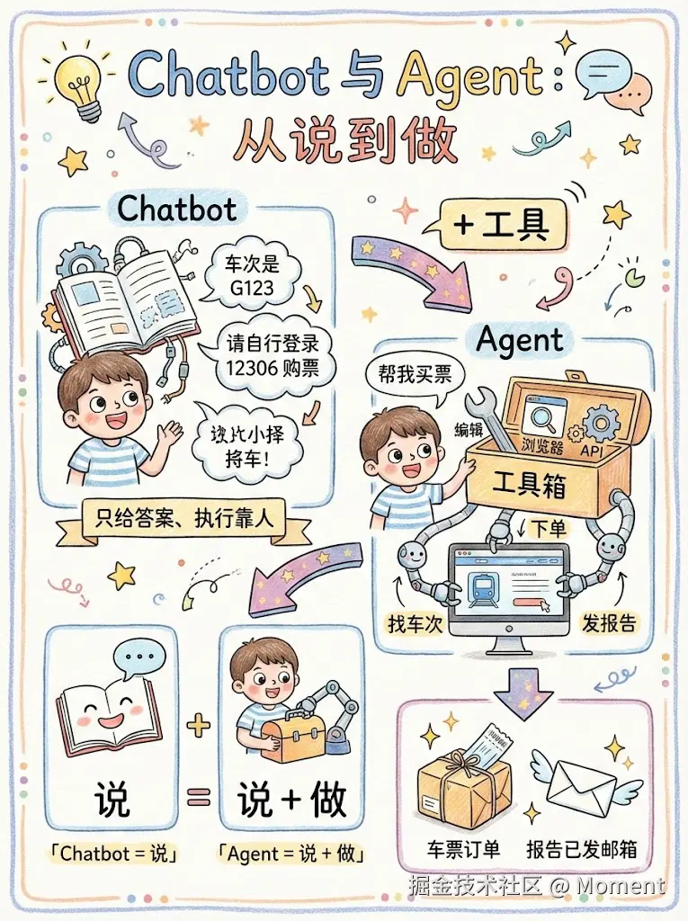 上图从左到右概括了 Chatbot 与 Agent 的差别。Chatbot 只产出文字答案,执行仍要你自己动手。Agent 则多了"工具"这一环,能直接操作电脑或外部服务,把"成品"交到你手上。