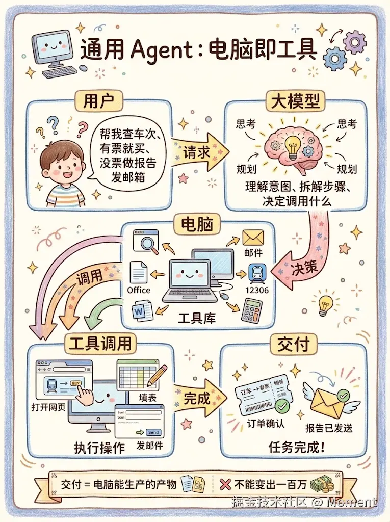 图中概括了通用 Agent 的工作方式:用户用自然语言下指令,大模型理解并拆解成步骤,把"电脑"当作统一工具,调用上面的软件和网络完成操作,最后把电脑能产出的结果(订单、报告、邮件等)交回给你。