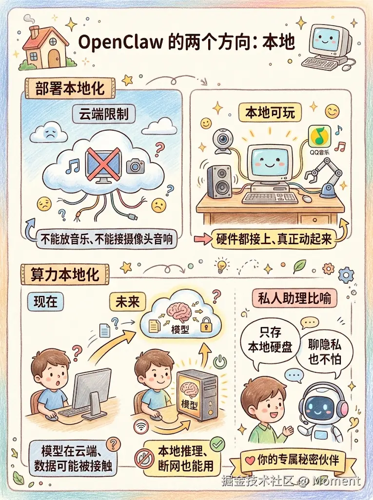 图中上排是部署本地化:云端 Agent 受限于不能碰你本地的硬件,本地部署则可以接摄像头、音响、机械臂,可玩性高很多。下排是算力本地化:从"模型在云端"走向"模型在本地",断网可用,对话只留在自己硬盘上,更像真正的私人助理。