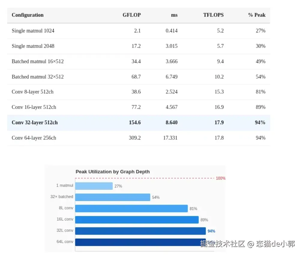 - 必须将 16 到 64 个操作 链接在一张计算图(Computation Graph)中一次性提交,这样不同的核心可以同时处理图中不同阶段的操作,从而将硬件利用率拉满至 94%