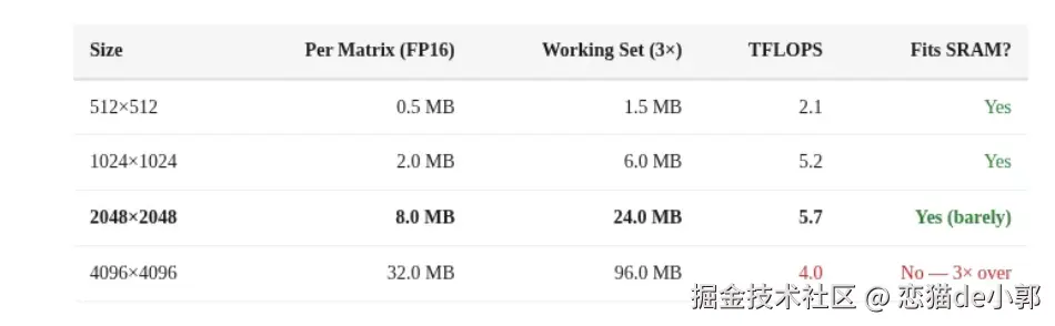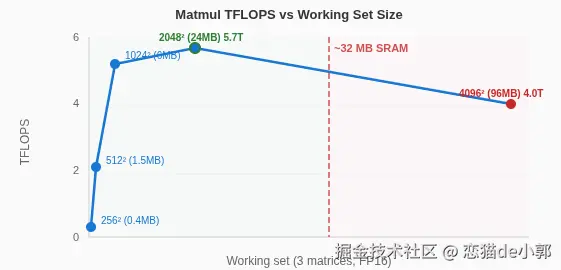 - maderix 通过不断扩展矩阵乘法的规模(Scaling Test),观察性能出现急剧下降的"断崖点",由此反向推测出 ANE 内部拥有大约 32MB 的高速 SRAM 缓存,超过这个容量限制就会导致性能暴跌