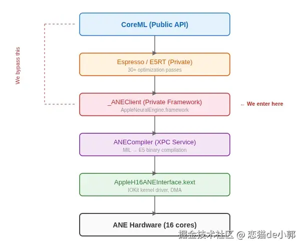 近日,有个大佬通过挖掘 Apple Neural Engine (ANE) ,针对苹果芯片底层 AI 逻辑做了一次细节公开,因为苹果 ANE(M4 芯片上为 16 核运算单元)长期以来是一个纯粹的"黑盒",对大家来说缺少公开接口、文档和指令集架构 (ISA),开发者只能通过 CoreML 框架间接调用,而这次作者 maderix 通过挖掘把 CoreML 给大家理清了一个清晰的轮廓。