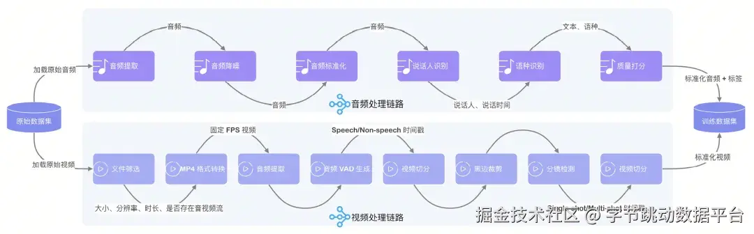 该流水线是模型训练的关键预处理环节,复杂度极高。其全链路包含音频降噪、格式标准化、说话人分离、语种识别及语音转文字(ASR)等15个核心节点。