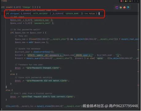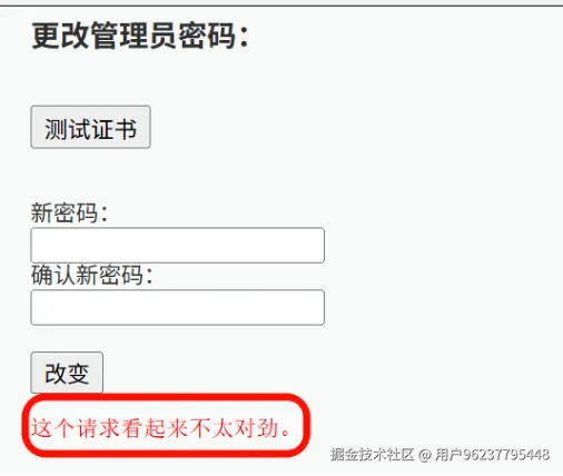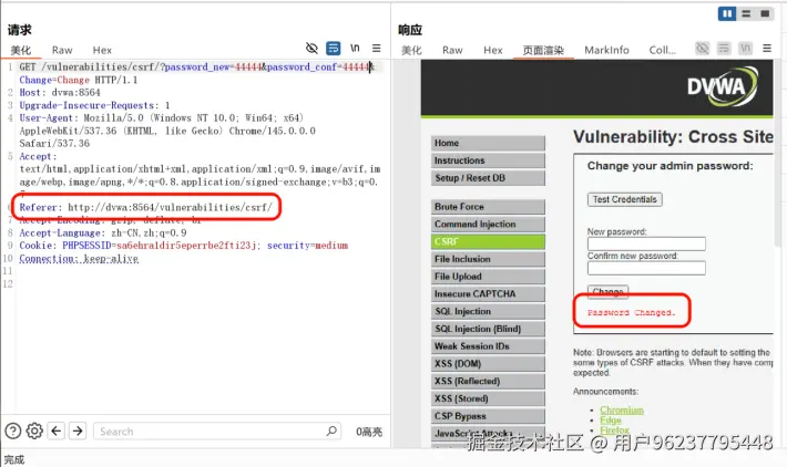 增加了 HTTP_REFERER 检测,验证请求是否来自本站。 观察url的参数 ?password_new=admin&password_conf=admin&Change=%B8%C4%B1%E4# 直接访问此url提示不正确