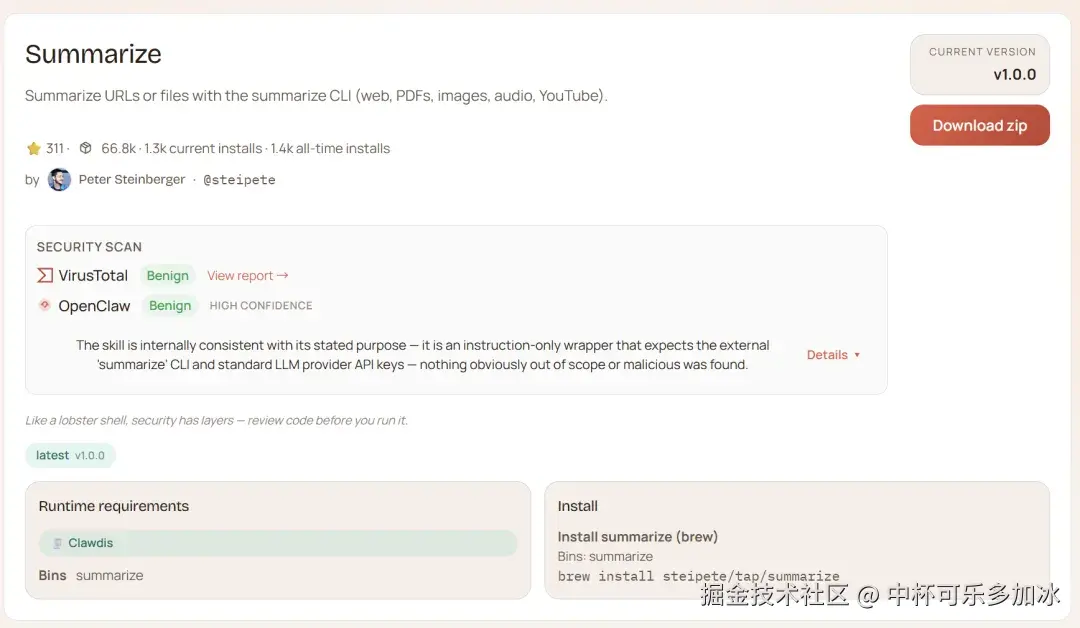 Summarize是仅次于Gog的第二大热门Skills,安装量超过37万次。这个Skill可以帮你总结各种格式的内容,包括:
