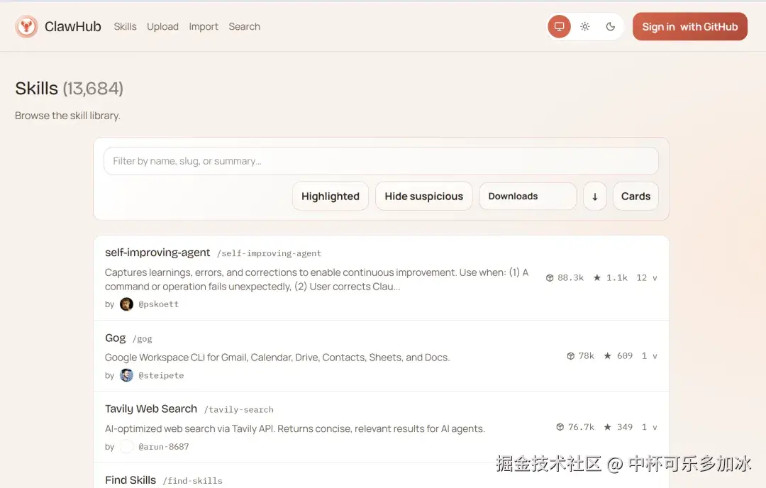 ClawHub(clawhub.com/skills) 是OpenClaw官方维护的Skills注册表,也是获取社区Skills的主要渠道。平台提供向量搜索功能,你可以用自然语言描述需求获取推荐。