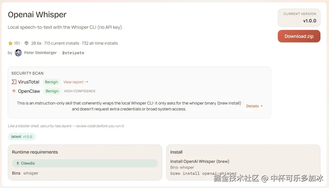OpenAI Whisper 是本地运行的语音识别Skill,安装量超过16万次。最大的特点是不需要API密钥即可使用。你可以用它来: