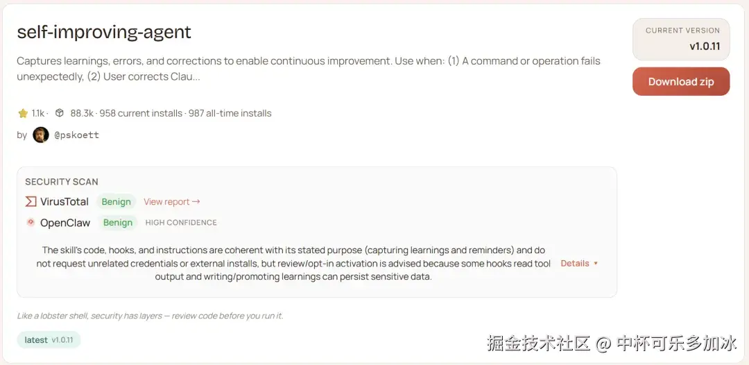 Self-Improving Agent是一个高级Skill,安装量超过29万次。它的核心功能是让OpenClaw能够从与你的互动中学习,不断优化自己的表现。当你纠正了OpenClaw的某个行为后,它会记住并在未来避免同样的错误。