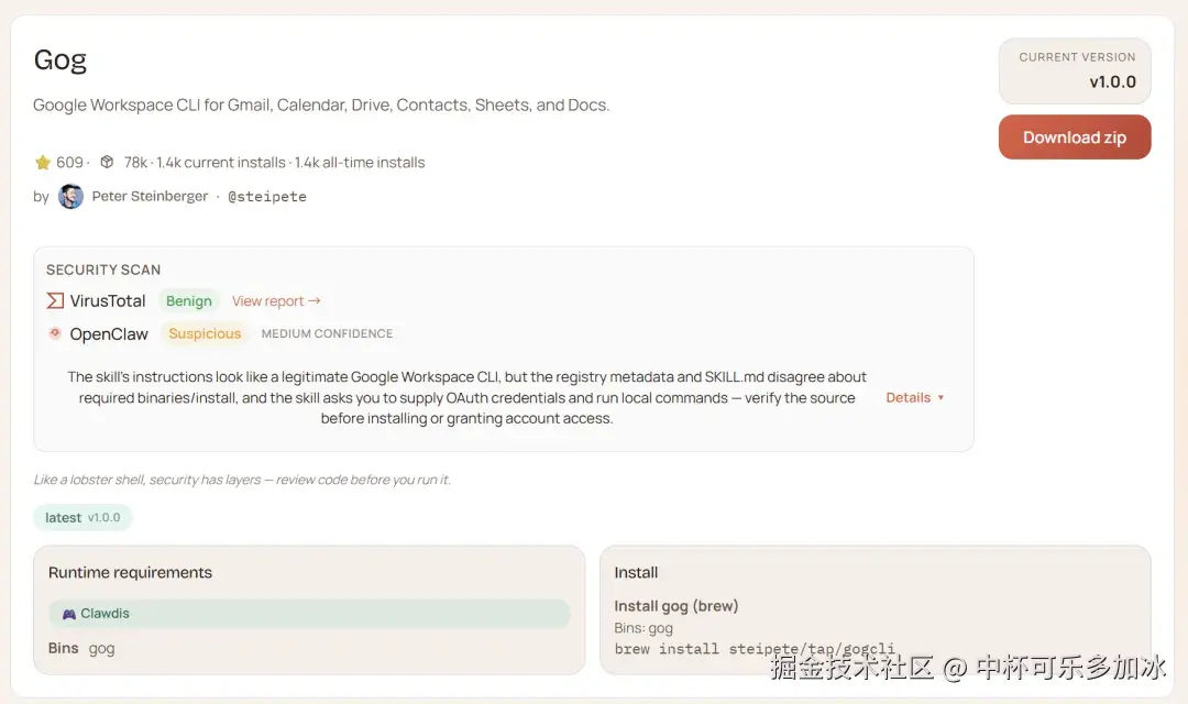 Gog是OpenClaw生态中下载量最高的Skills,安装量已超过48万次。这个Skill彻底打通了Google Workspace的全场景操作能力,通过CLI命令行模式,你无需打开网页就能直接操控Gmail、Google日历、Google云端硬盘、Google文档及Google表格。