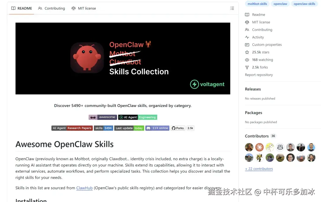 Awesome OpenClaw Skills(github.com/VoltAgent/a... 是一个高质量的社区精选列表。该项目从ClawHub的 Skills中进行了分类整理,按功能领域划分为编码Agents、IDE集成、数据处理、文件管理等133个以上子类目,便于你按需查找。