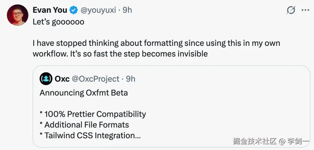 因为本身 Oxfmt 就可以看作是 Prettier 的Rust版本,所以团队在开发的时候也选择了对 Prettier API的完全兼容,所以开发者一般是没啥感知的。