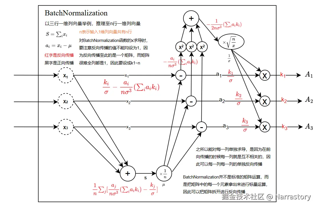Batch Normalization层会对输入进来的矩阵的每一列进行如下处理,假设有一列元素 <math xmlns="http://www.w3.org/1998/Math/MathML"> [ x 1 , x 2 , . . . , x n ] T [x_{1},x_{2},...,x_{n}]^{T} </math>[x1,x2,...,xn]T