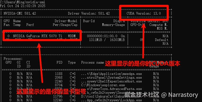 如果出现类似下图的信息,说明你的电脑有英伟达显卡,并且可以看到右上角的 CUDA Version(例如 11.8、12.1 等)。