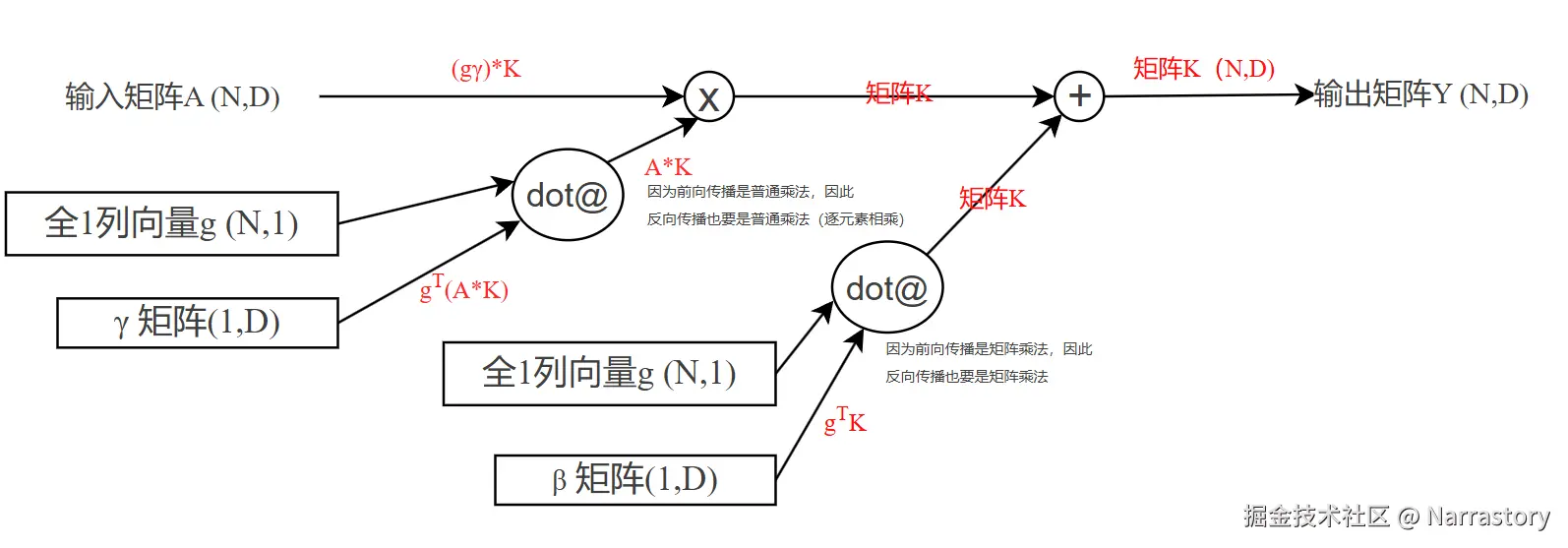 <math xmlns="http://www.w3.org/1998/Math/MathML"> 1 N 1_{N} </math>1N 是全为1的一维列向量, <math xmlns="http://www.w3.org/1998/Math/MathML"> ⊙ \odot </math>⊙ 是逐元素相乘符号,下图中的 <math xmlns="http://www.w3.org/1998/Math/MathML"> d o t @ dot@ </math>dot@ 运算就是矩阵乘法
