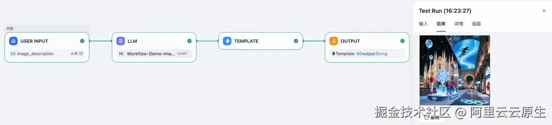 本 Demo 的流程如下图所示,模型节点中的模型使用上述步骤创建的模型,用户输入的图片描述作为模型节点的 user prompt,生成图片的 url 在模型节点的 text 信息中返回,使用模版转换节点将返回结果转换为 markdown 格式,方便在输出节点中直接展示图片结果。