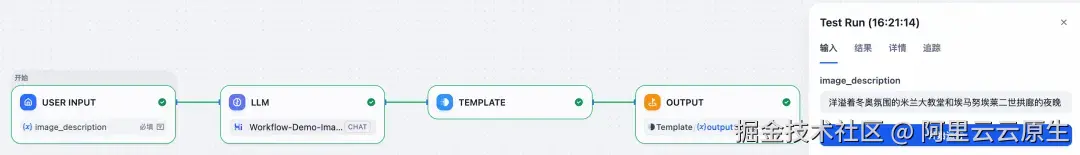 测试运行上述 Workflow 的输入和结果如下图所示。