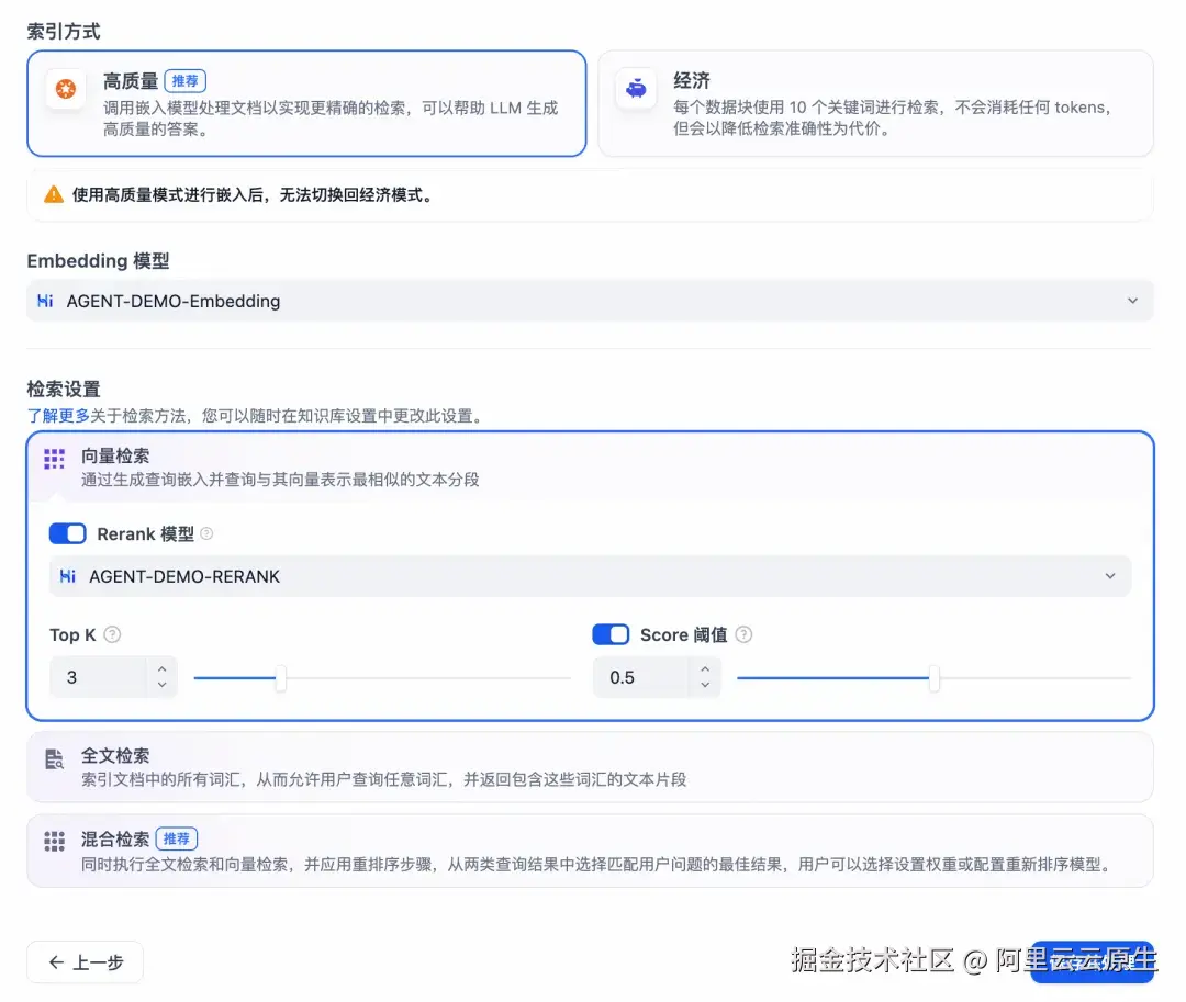 在创建知识库时,Embedding 和 Rerank 模型选择上述步骤中通过 Higress 插件创建的模型即可。