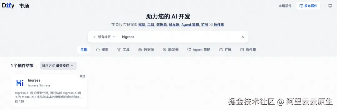 开发者在 Dify 插件市场搜索 Higress 即可获取对应插件并安装。