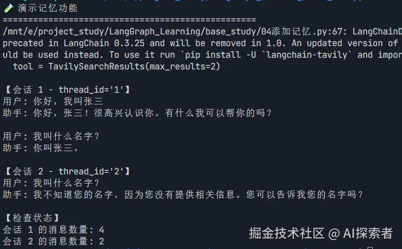 展示同一个 thread_id 能记住上下文,不同 thread_id 无法共享记忆。