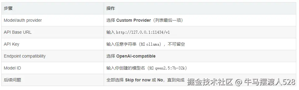由于 Ollama 是自定义本地模型,选择Custom Provider(自定义提供商),按向导配置: