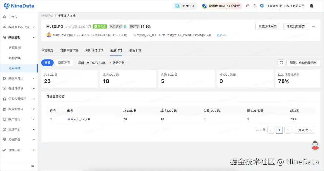 静态分析无法覆盖所有执行时问题。NineData 提供 SQL 流量回放 ,相当于迁移前全真演练: