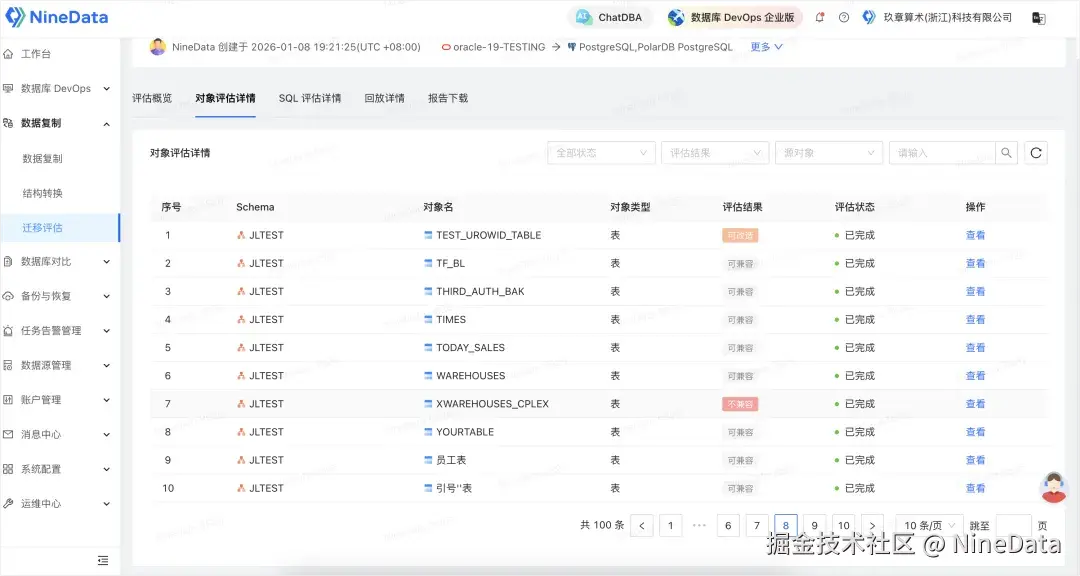 NineData 迁移评估是对源数据库与目标数据库之间的对象 兼容性 和 SQL 兼容性进行系统分析,帮你清晰回答两个关键问题: