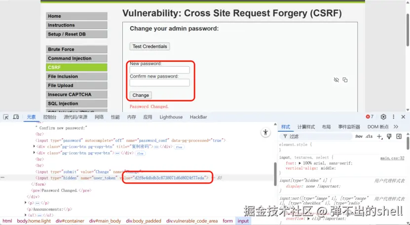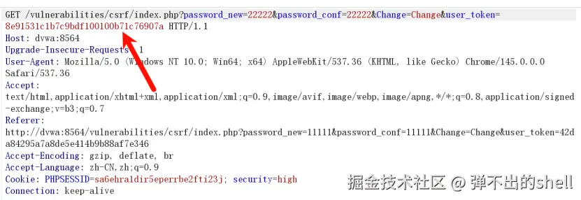 High 难度新增user_token 验证 ,token 明文显示在前端HTML源码中,单纯构造CSRF链接无法绕过,需配合XSS漏洞提取token后组合攻击。