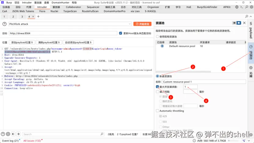 - 爆破设置 :将资源池发包最大次数改为1 (禁止并发,避免token失效),加载密码字典开始爆破。