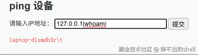 提交后成功执行系统命令,返回当前用户信息。