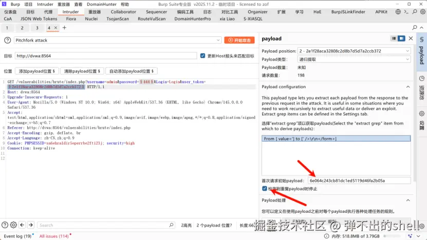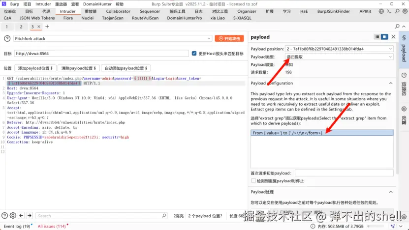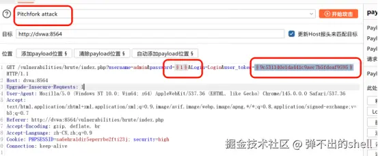 Intruder,选择Pitchfork 交叉爆破 ,标记password和user_token为爆破位置;