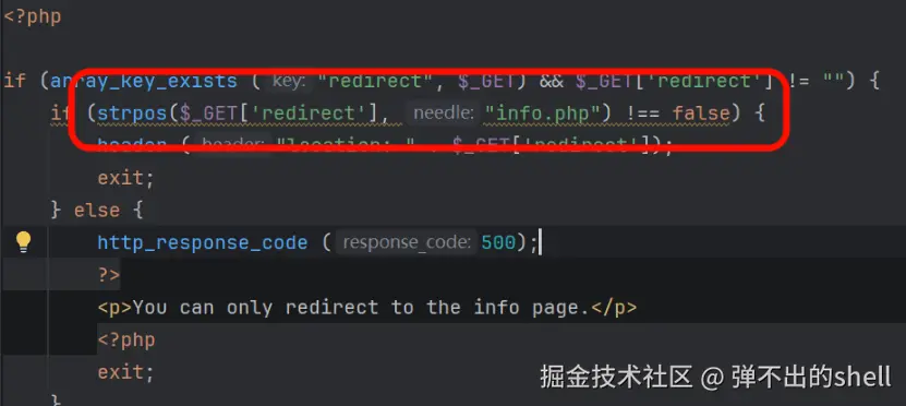 High 难度对redirect参数做了关键字匹配过滤 (仅允许包含info.php),但未限制info.php的位置,可构造包含info.php的恶意URL,实现任意地址重定向。