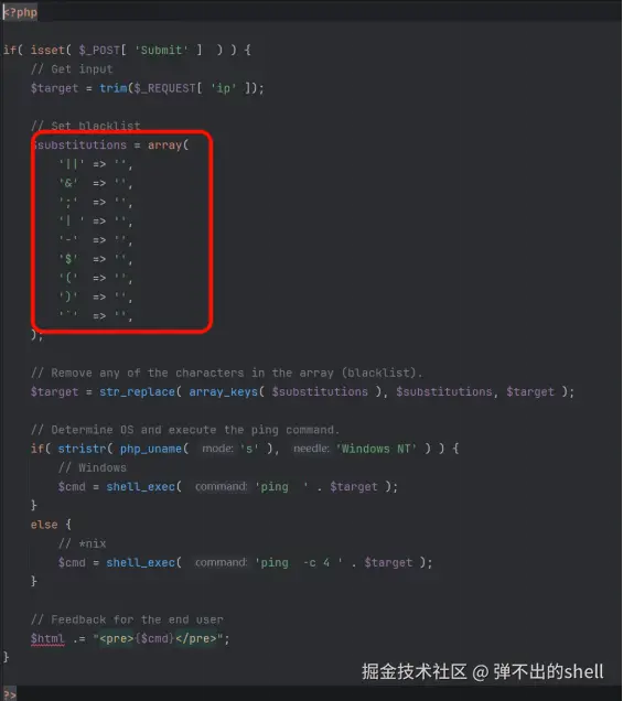 High 难度对管道符等命令分隔符做了黑名单过滤,但过滤代码存在空格书写错误,导致过滤失效,可构造无空格的命令拼接Payload。