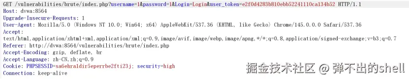 High 难度新增时间延迟 +user_token 验证,token 明文显示在前端页面,需动态提取 token 配合爆破。