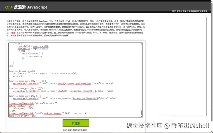 通过Burp抓包获取混淆的JS代码,反混淆 后得到3个核心加密函数,执行顺序为:token_part_1 → token_part_2(300ms延时) → token_part_3(点击提交触发)。