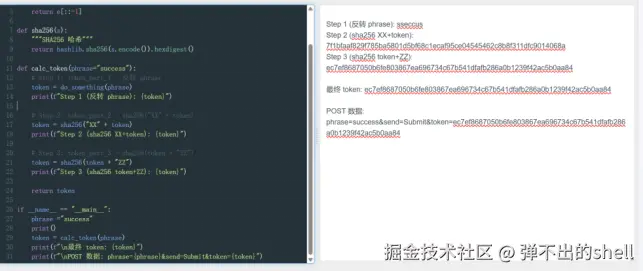 通过Python实现字符串反转+SHA256加密,直接生成最终token,构造POST请求提交。