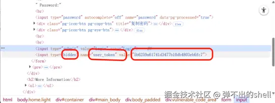 user_token藏在隐藏输入框中,攻击者无法直接获取受害者的token,但可通过XSS注入脚本自动提取受害者的token 并拼接CSRF请求。