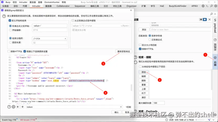 user_token的Payload类型选择递归提取 ,并填入初始请求的有效token (抓包获取的原始token)。