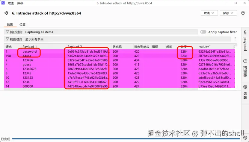 - 结果分析 :按响应长度排序 ,长度与其他条目不同的即为正确密码(正确登录的响应页面与错误页面长度存在明显差异)。