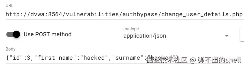 http://dvwa:8564/vulnerabilities/authbypass/change_user_details.php; -