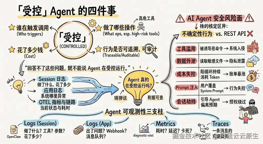 "受控 "至少包含四件事:谁 在触发调用、花了多少钱 、做了哪些操作 (尤其是高危工具)、行为是否可追溯 、可审计。回答不了这些问题,就不能说 Agent 在受控运行。