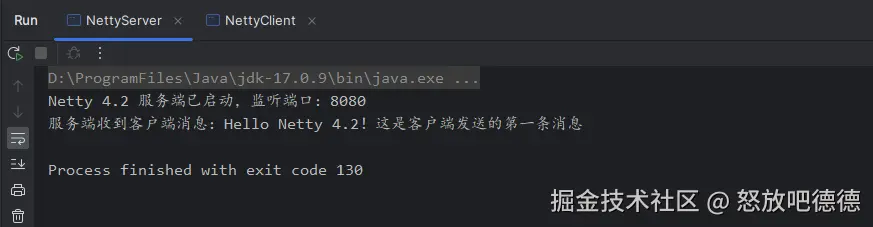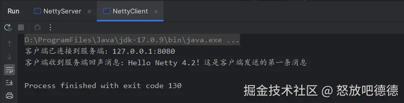 - 查看客户端控制台,会输出"客户端收到服务端回声消息:Hello Netty 4.2!这是客户端发送的第一条消息",表示回声服务正常运行。