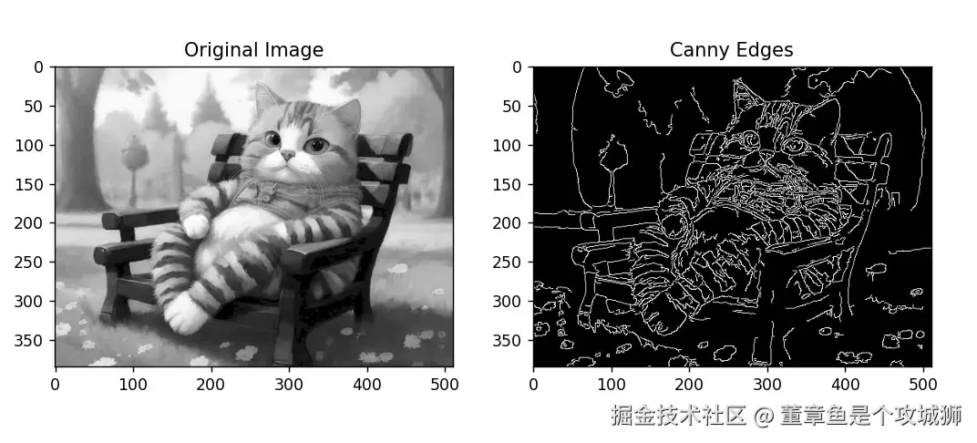 在上面的例子中,使用 cv2.Canny 函数中的 Canny 边缘检测算法,然后使用 matplotlib 库显示原始图像和检测到的边缘的图像。