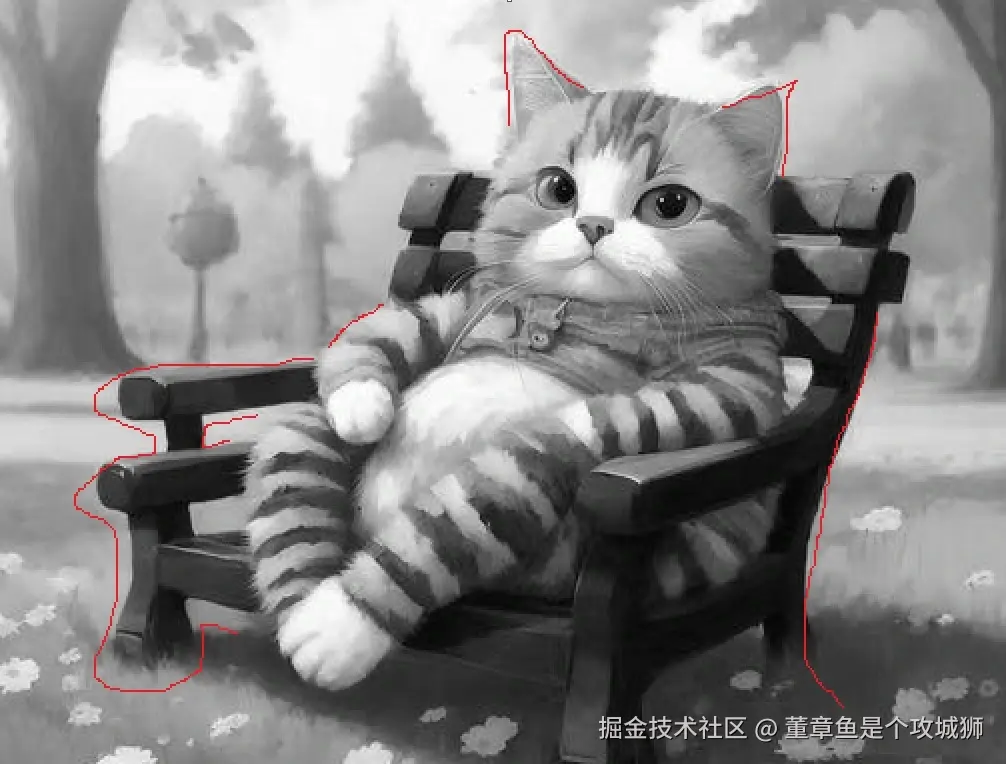 比如下面这张图片,我用红笔粗略的画出了一些物体的边缘,猫耳朵和背景很明显的边缘,椅子和背景以及椅子和猫咪的边缘等。