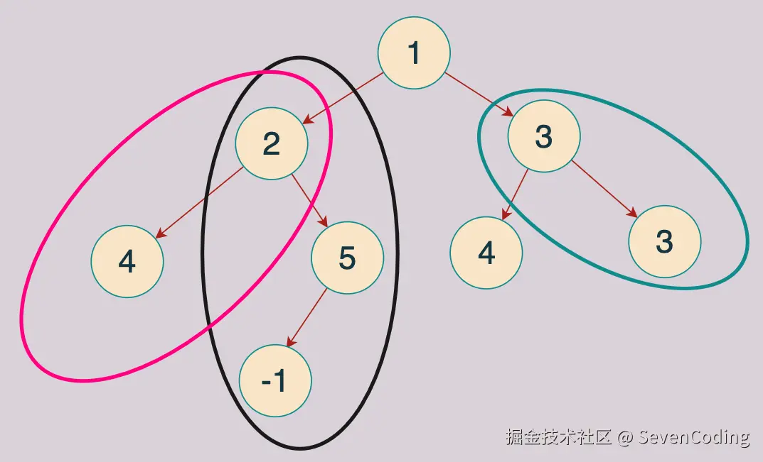 假如⼆叉树 root 为 {1,2,3,4,5,4,3,#,#,-1} , sum=6 ,那么总共如下所示,