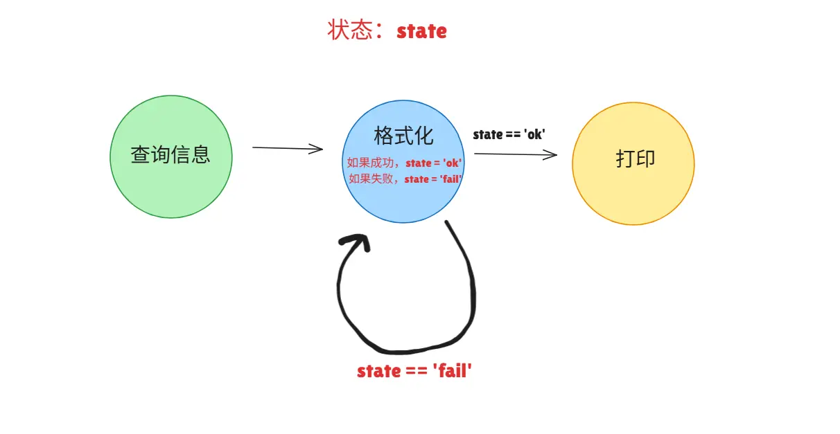 以上图为例,如果格式化失败,那么state='fail',而在选择连线时,因为 state == 'fail',因此进入了格式化自循环的连线。