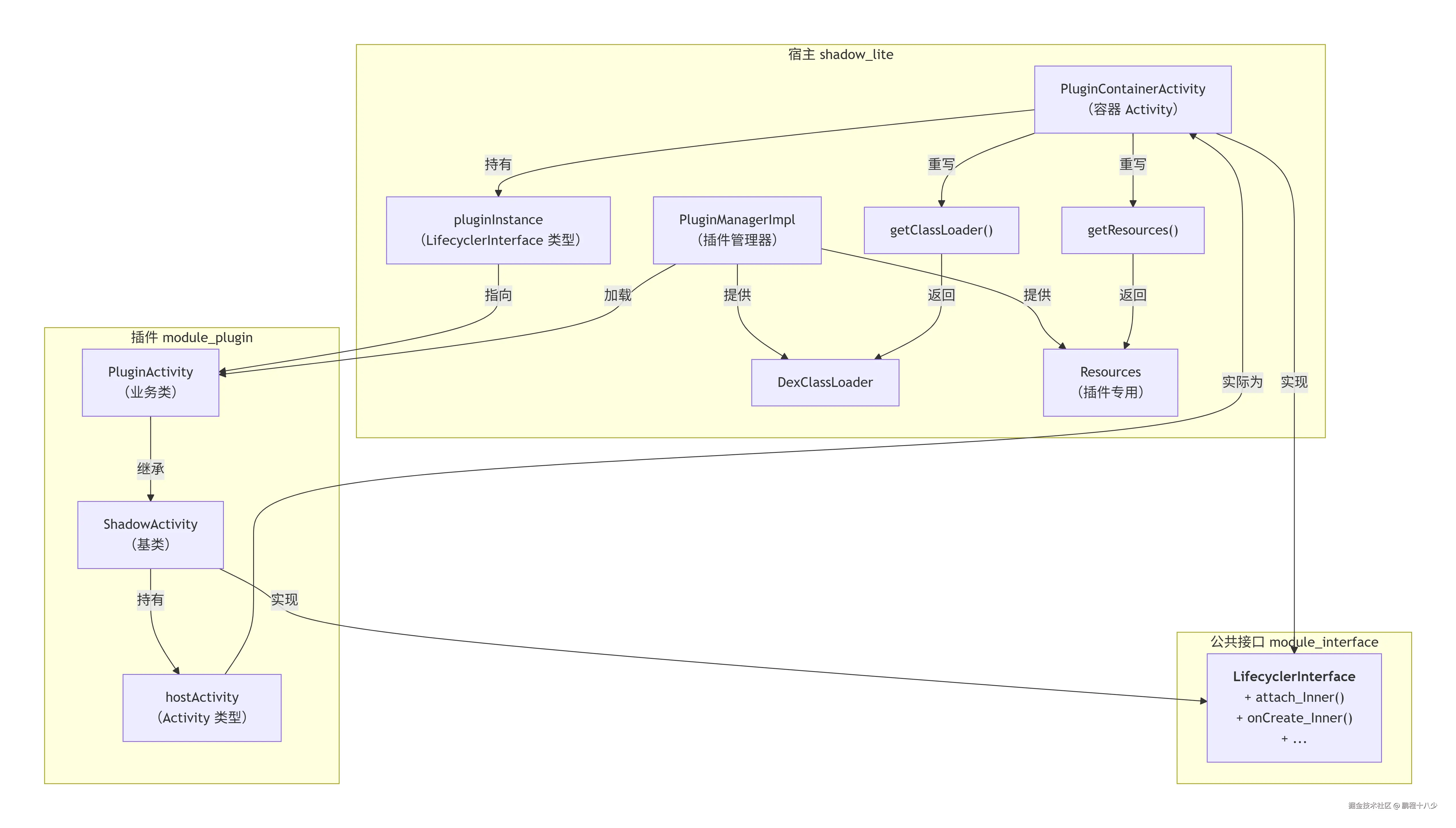ShadowLite 的核心思路就是将这三点分离并重新组合 。我们将插件 Activity 降级为一个实现了特定生命周期接口的普通对象。宿主的容器 Activity 负责提供真实的 Context、Resources 和 ClassLoader,并将系统回调的事件(如 onCreate)转发给插件对象。