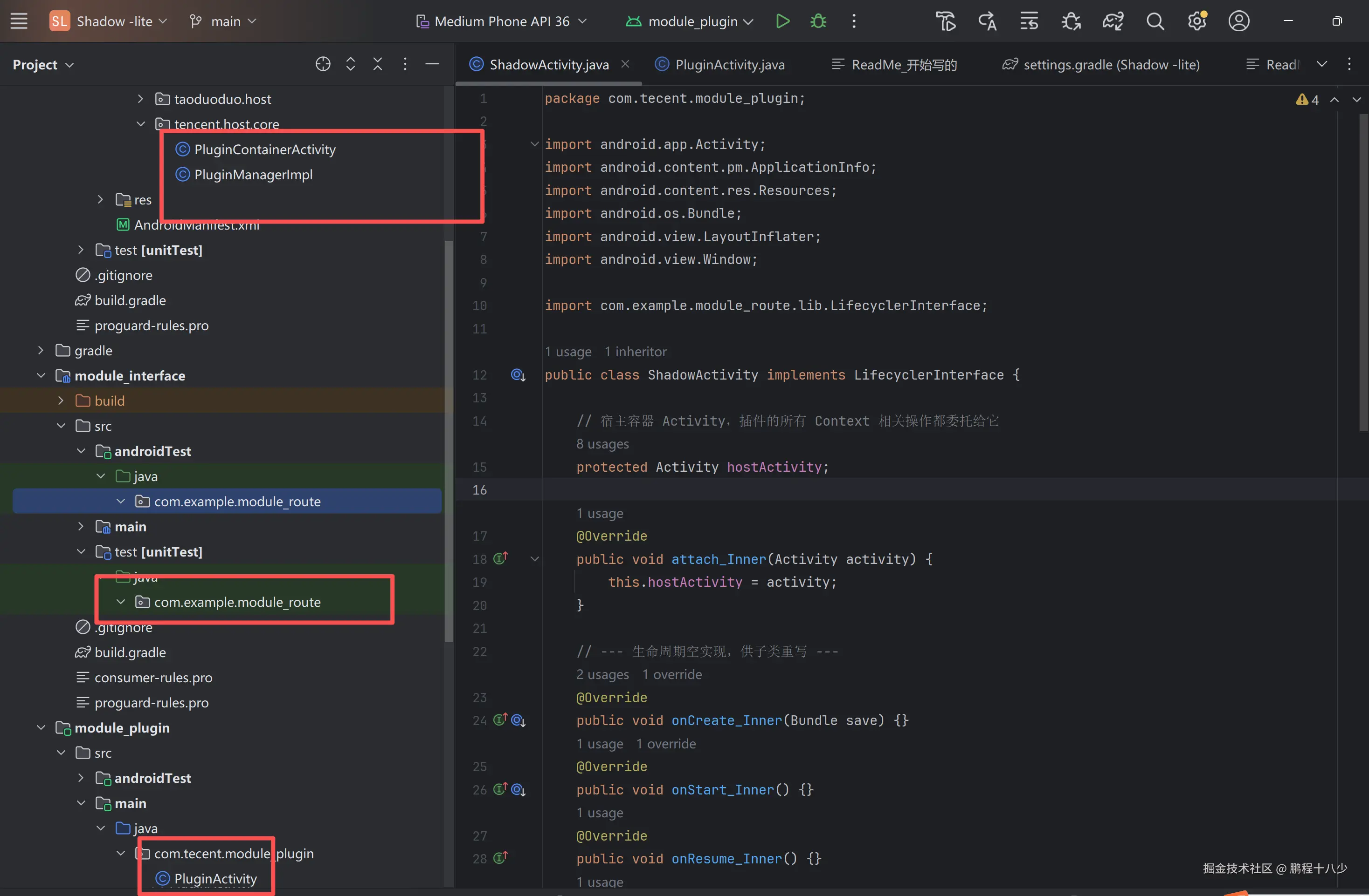 module_interface:公共接口库。定义生命周期回调接口,宿主和插件都依赖它。module_plugin:插件工程。包含具体的业务 Activity,但它们不继承android.app.Activity,而是继承我们定义的普通基类。shadow_lite(宿主) :宿主工程。包含PluginContainerActivity(壳子)和####PluginManagerImpl``(加载器)。
