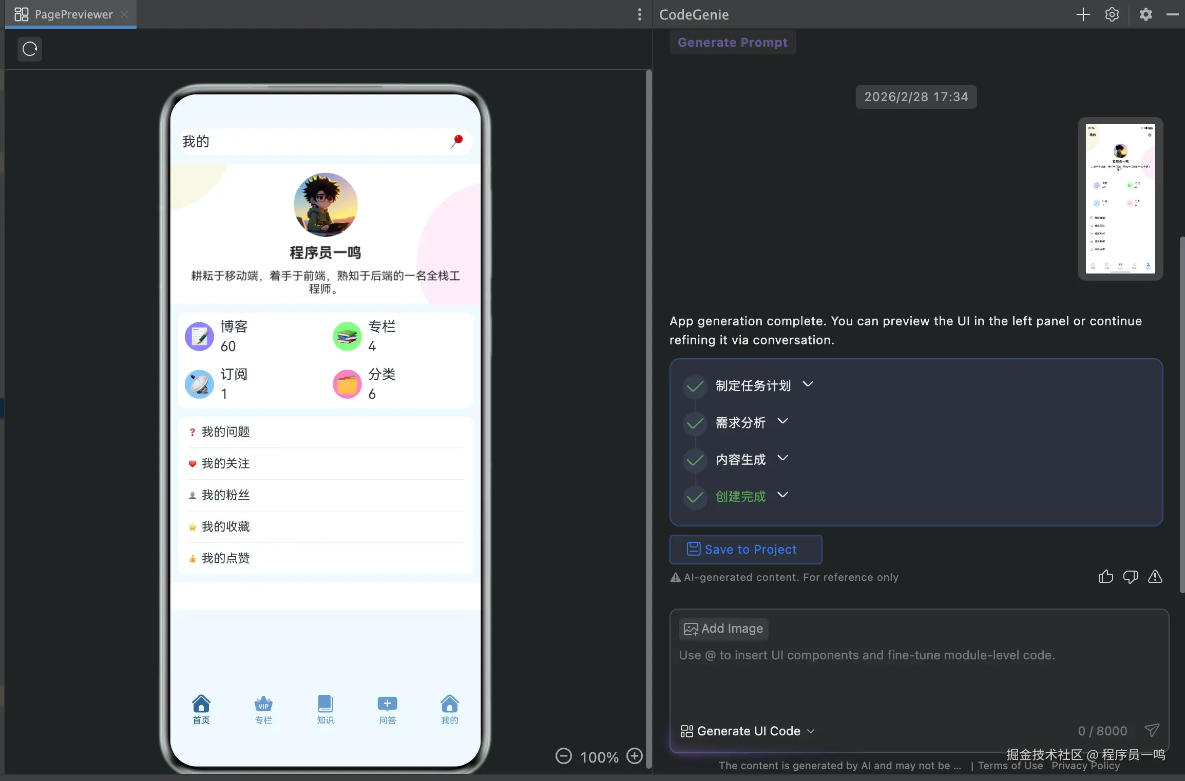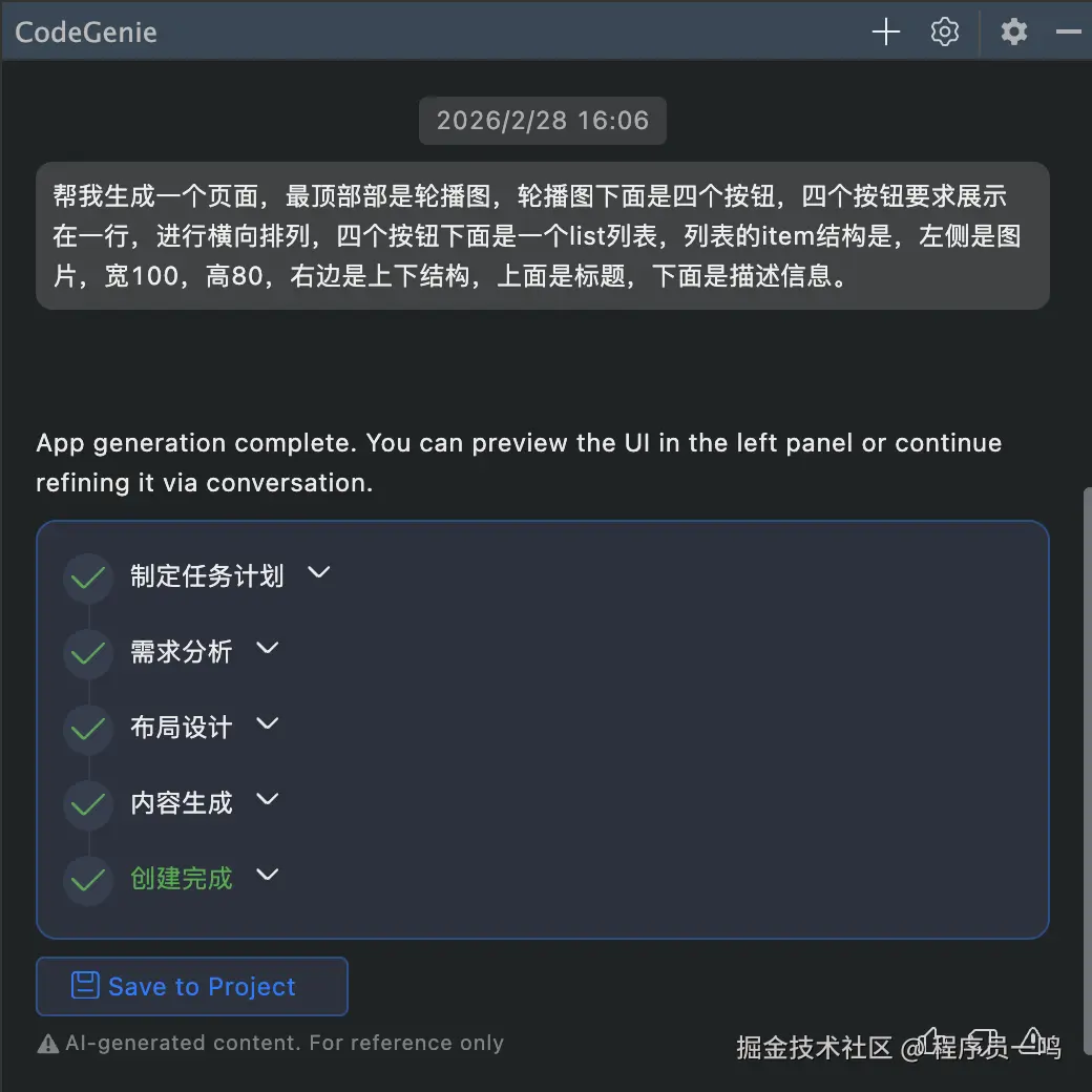 CodeGenie是DevEcoStudio中一个自带的AI工具,在之前的文章中,对于其中的功能做过部分的解读,随着官方的更新迭代,如今的CodeGenie,可以说变得越来越实用,越来越强大,在6.0.0.828及以后的版本中,就新增了一个非常实用的功能,那就是支持根据图片,进行页面功能生成的能力。